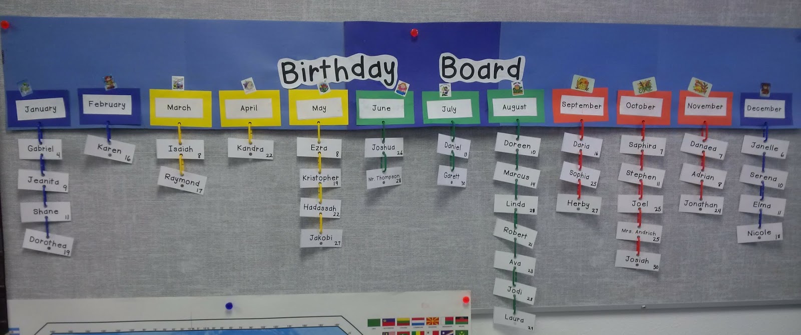 - We colour-coded the month labels by gluing them to different coloured card stock, depending on the season. I printed the name of each students and staff member on white card stock.